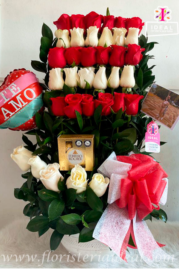 Hermoso ramo de una cara elaborado en bellas rosas rojas y blancas, acompañado de un lindo globo y deliciosos chocolates ferrero x4, mas tarjeta personalizada para la ocasion..