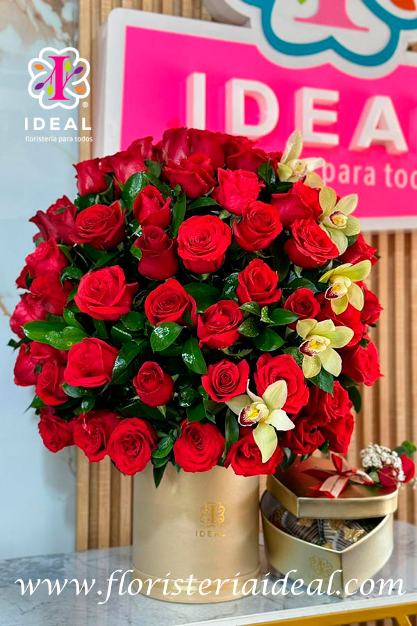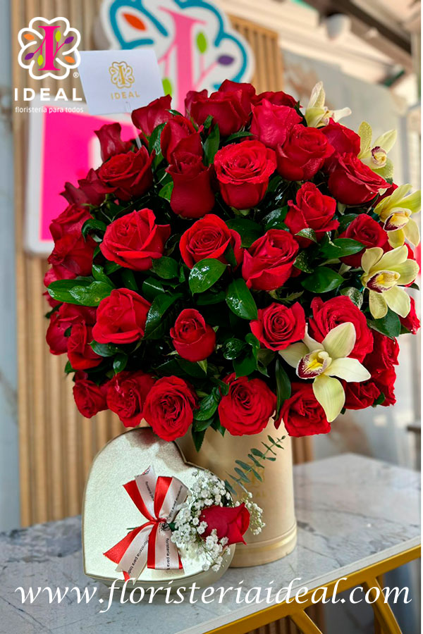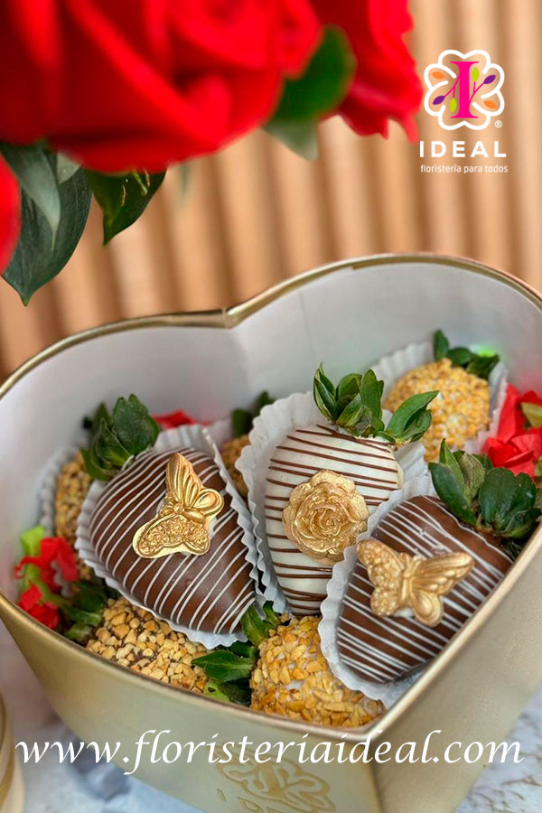 hermoso arreglo premium elaborado en rosas rojas y acompañado de unas espectaculares fresas cubiertas de chocolate