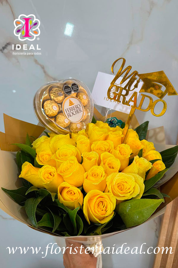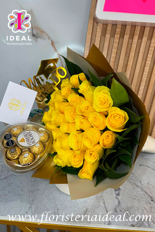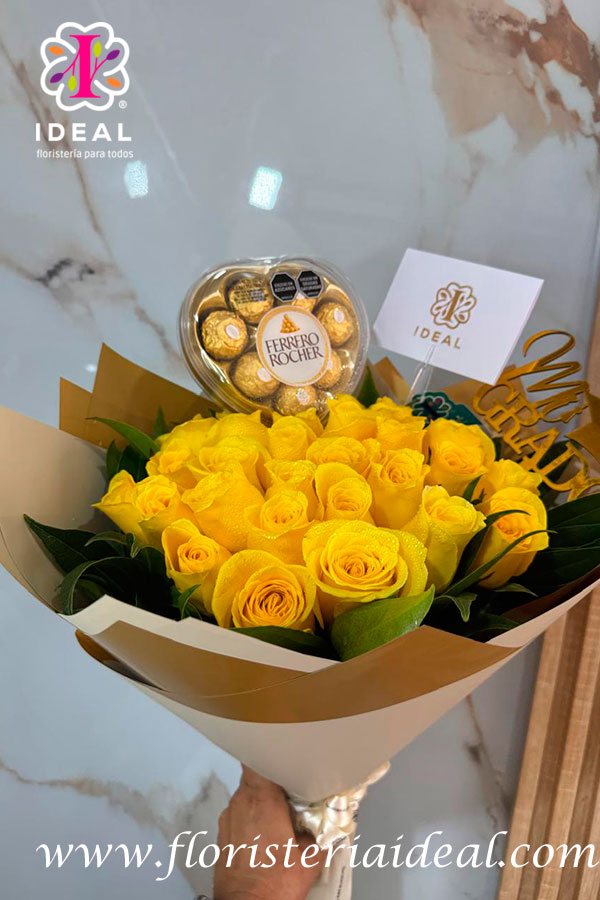 hermoso bouquet de rosas amarillas acompañadas de un corazon ferrero