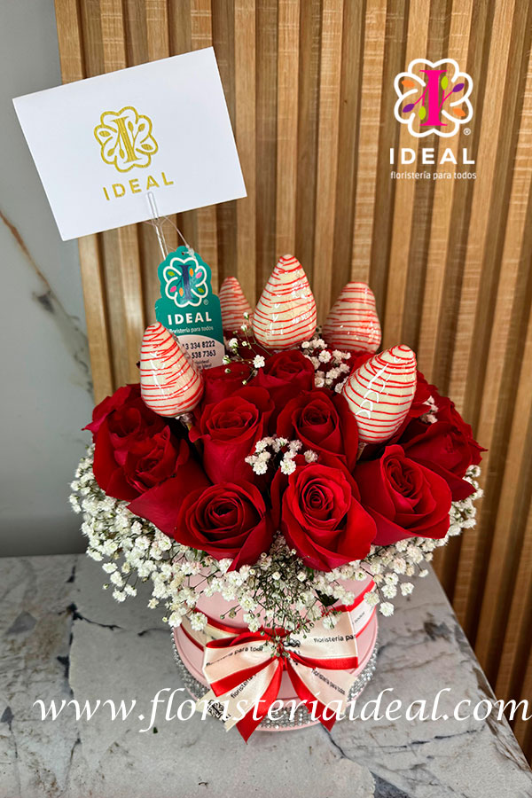 hermoso arreglo floral en rosa roja acompañado de fresas cubiertas de chocolate
