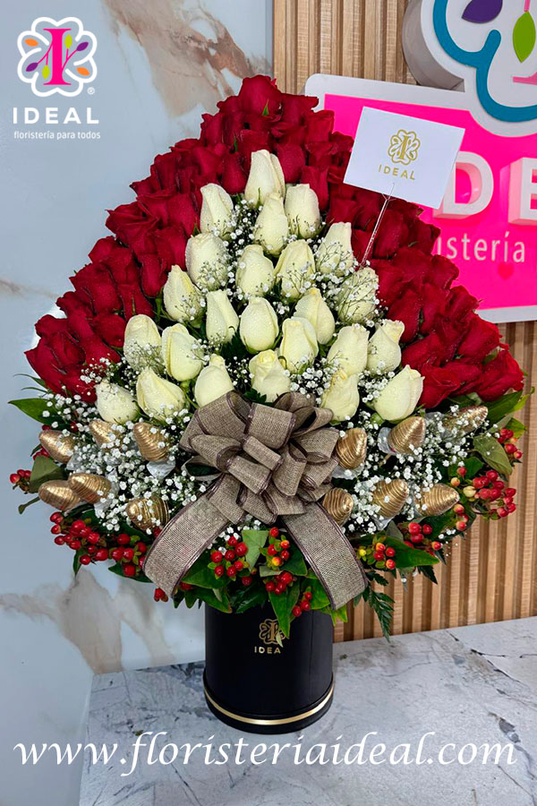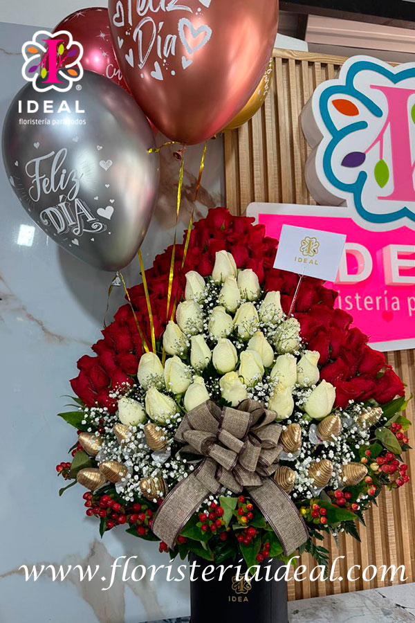 hermoso y espectacular ramo premium con rosas blancas y rojas y unas espectaculares fresas cubiertas de chocolate