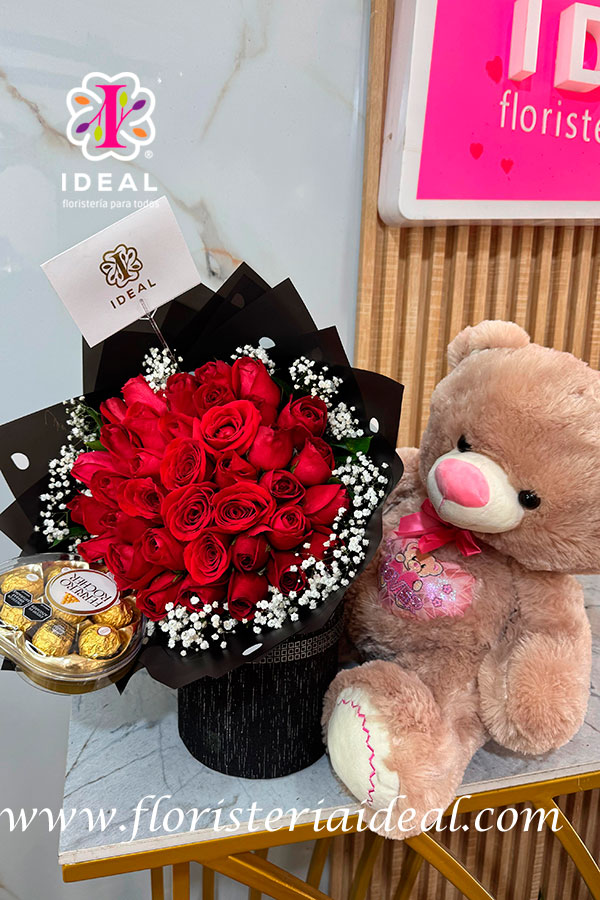 Peluches con flores y chocolates