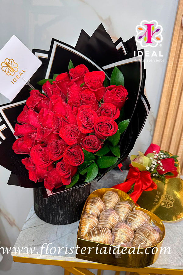 espectacular para san valentin un hermoso bouquet de rosa roja junto a unas hermosas y deliciosas fresas