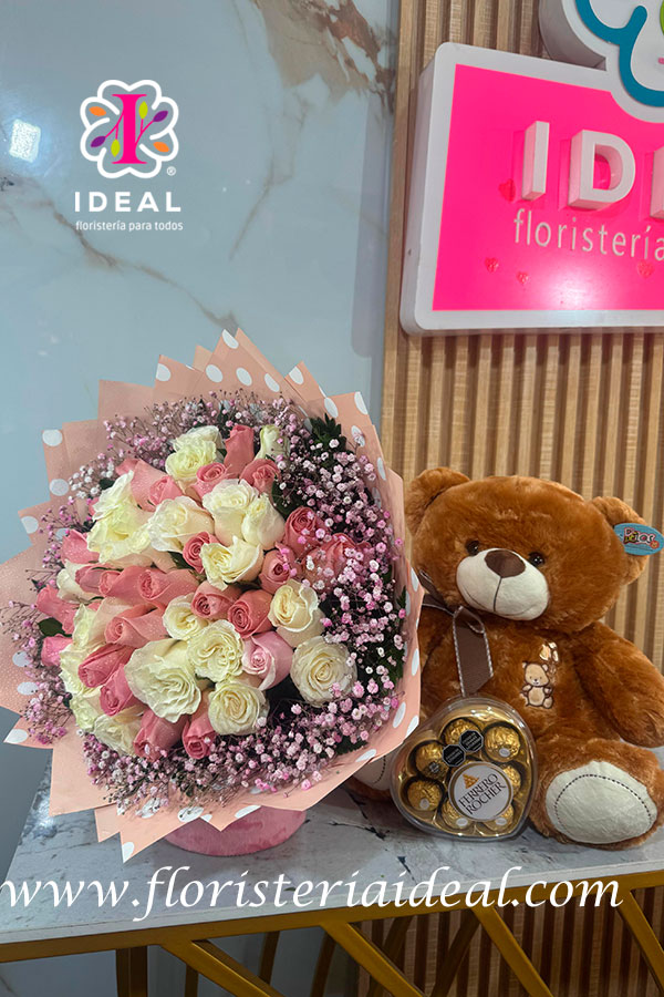 Peluches con flores y chocolates