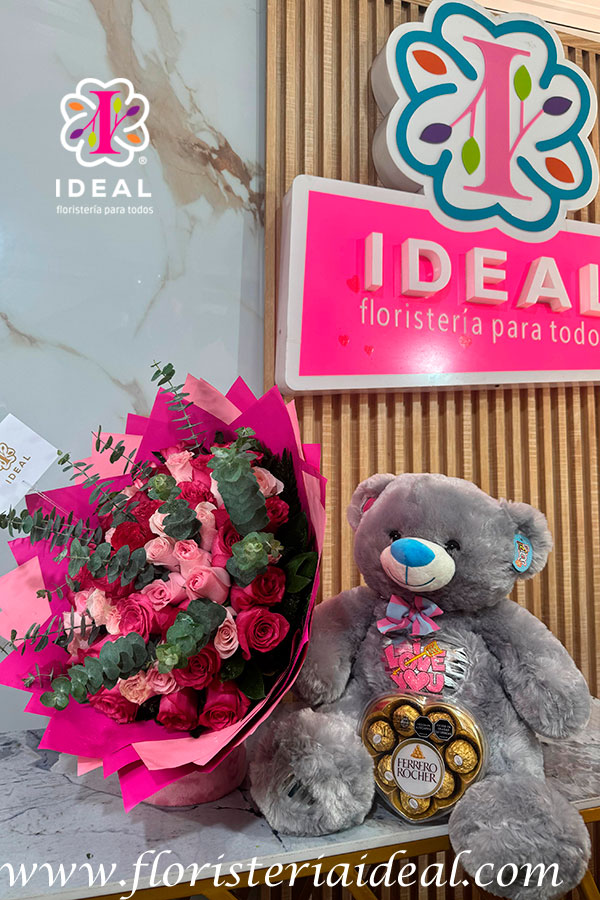 hermoso arreglo manual elaborado en rosa fucsia acompañado de un espectacular peluche