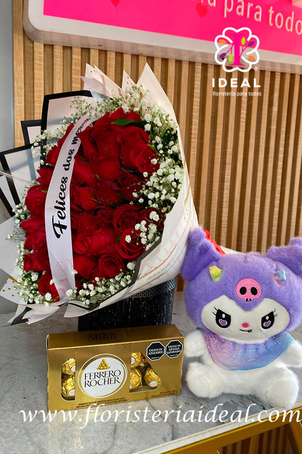 hermoso arreglo floral junto a una kuromi elaborado en rosa roja