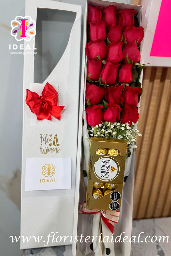 hermosa caja elaborada en rosa roja con un ferrero rocher para san valentin