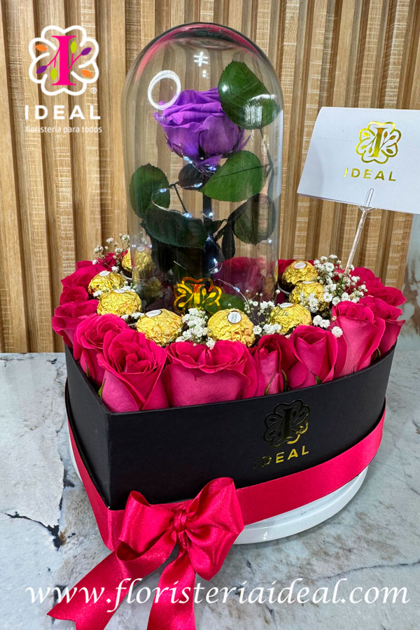 espectacular corazon acompañada de una rosa preservada
