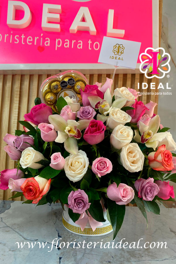 espectacular arreglo floral en forma redonda en diversos colores de rosa