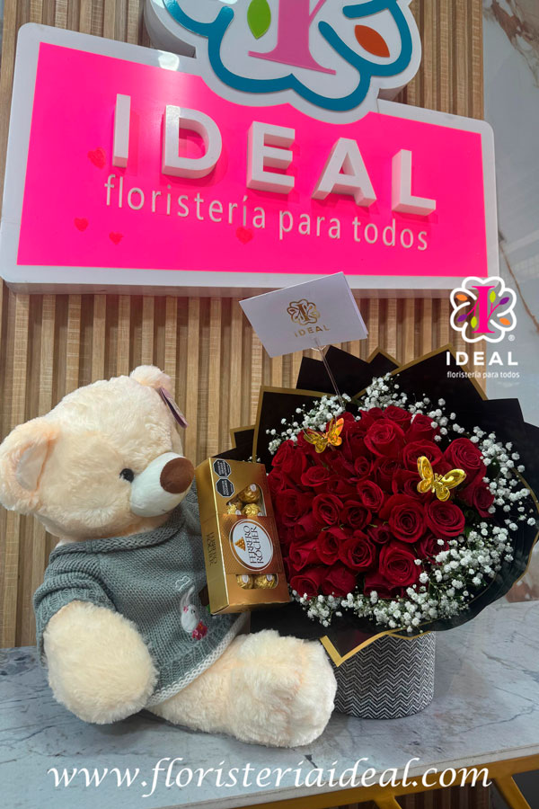 espectacular arreglo floral acompañado de un hermoso oso y unos chocolates