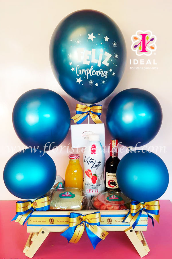 Delicado desayuno sorpresa para hombre, incluye: * Sándwich de pollo. * Ensalada de Frutas. * Postre. * Jugo de Naranja. * Yogurt. * Vino gato negro 375 ml * Globos * Tarjeta para la ocasión.