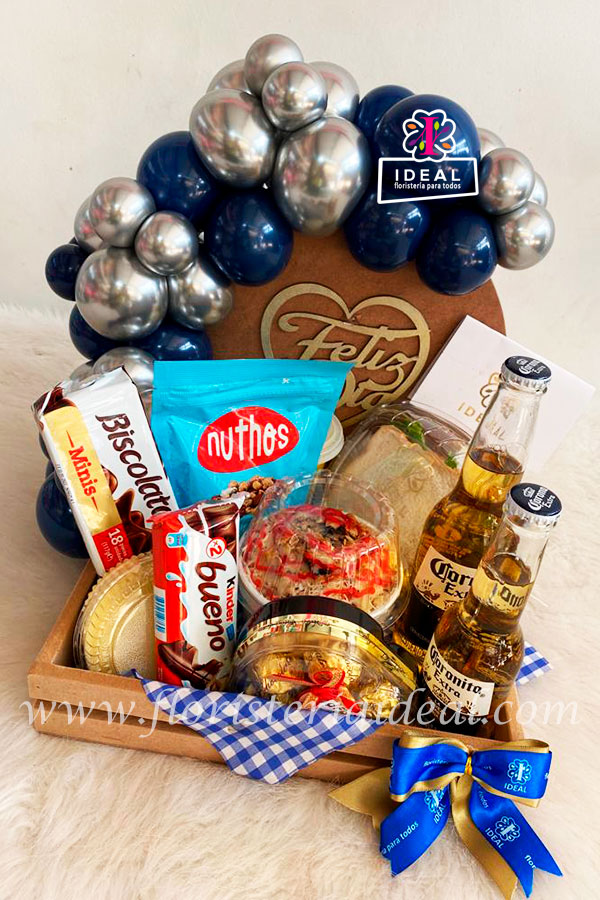 Hermoso desayuno sorpresa , en base guacal (madera) con un contenido de : * Sándwich de Pollo * Jugo * Ensalada de frutas * Postre * Frutos secos * Chocolatina Hersey * 2 Cerveza Corona * Arreglo en globos * Tarjeta para la ocasión.