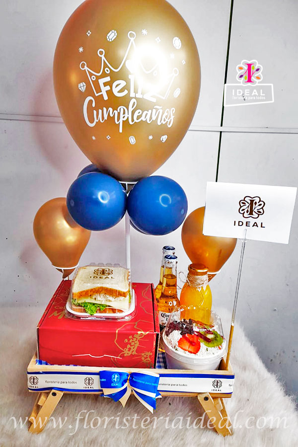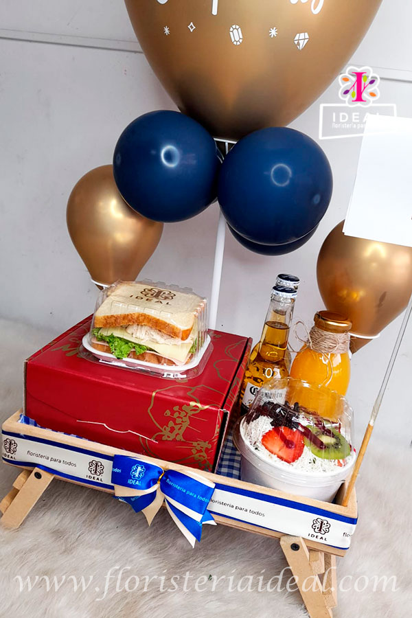 Delicado Desayuno sorpresa , incluye: * sándwich de pollo * ensalada de frutas * Jugo de naranja * Cereal * Porción de torta * 2 cervezas * Maní Especial * Globos decoración * Tarjeta para la ocasión.