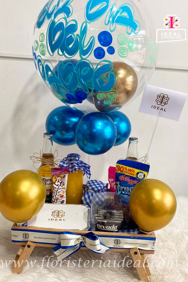 Desayuno sorpresa elaborado con : * Empanadas * huevos al gusto * 2 Cervezas corona * Frutos secos * gomas *Jugo de naranja * torta pequeña * Decoración con globos * Tarjeta para la ocasión