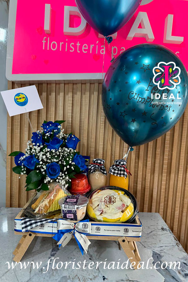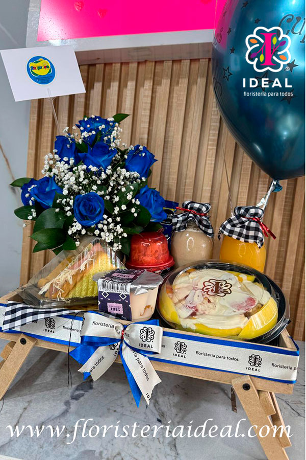 espectacular desayuno sorpresa acompañado de sándwich de pollo ensalada de frutas postre jugo de naranja milo bonyour Brownie