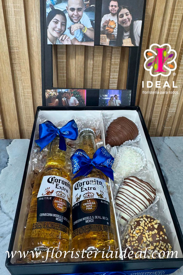 delicada cajita para hombre acompañado de dos cervezas y cuatro fresas