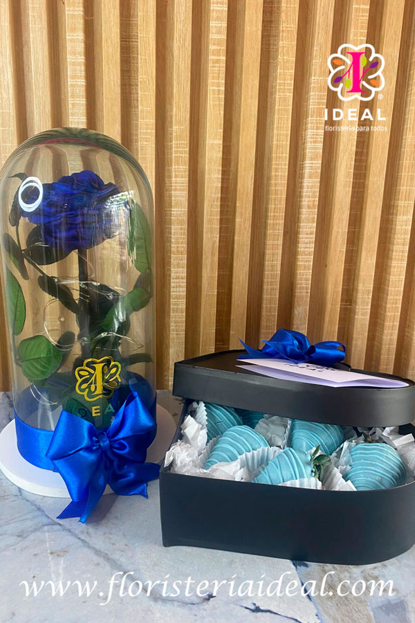 el combo perfecto para papa, una hermosa rosa preservada acompañado de una caja de fresas cubiertas de chocolate