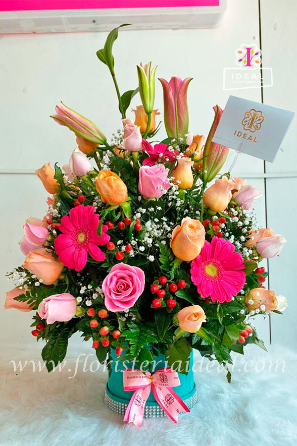 Linda caja redonda elaborada en rosas de colores, gerberas, lirios, cafeto y follaje, incluye tarjeta para la ocasión