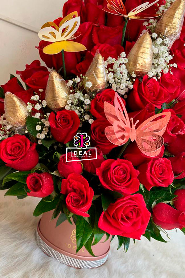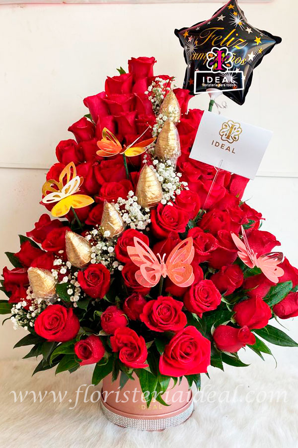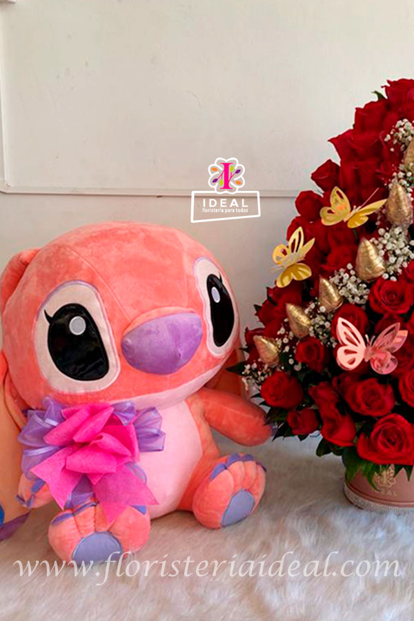 Especial arreglo de rosas y choco fresas doradas, acompañado de hermoso peluche Stitch mediano incluye tarjeta para la ocasión mas globos en helio.
