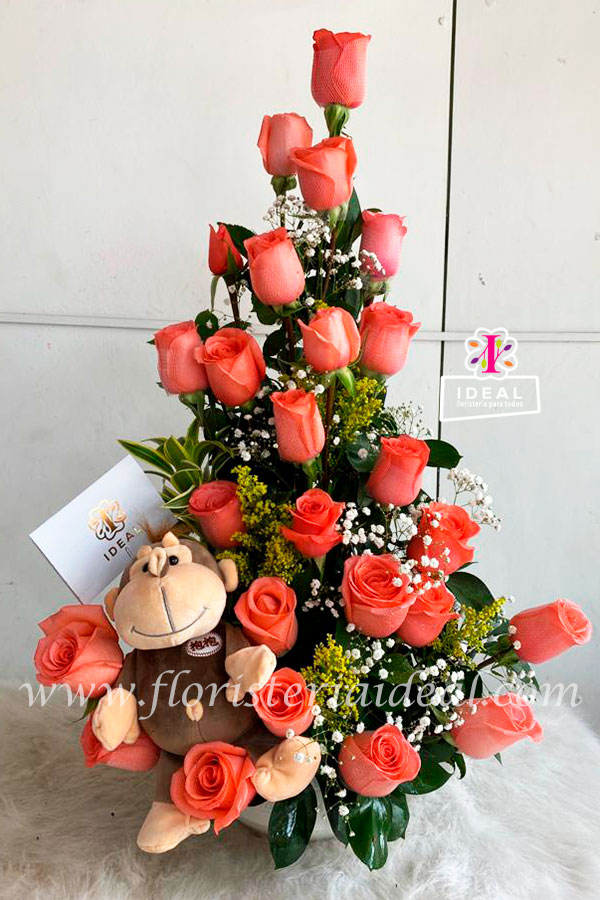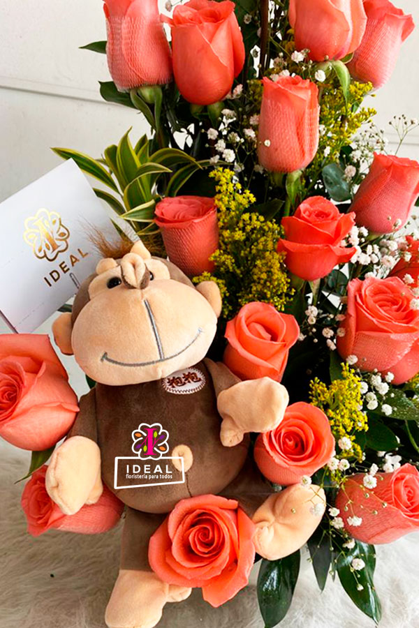 Delicado arreglo floral elaborado en bellas rosas color salmón y delicados follajes esta acompañado de lindo peluche mas tarjeta para ocasión