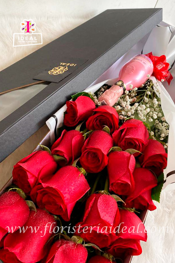 Hermosa caja larga de rosas acompañada de botella de champan jp chenett y su tarjeta respectiva con mensaje deseado.