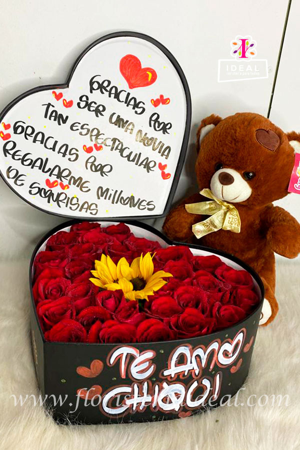Delicada caja de rosas y girasol tipo cuerina de corazón marcada según la ocasión acompañado de tierno peluche con su respectiva tarjeta y mensaje deseado.