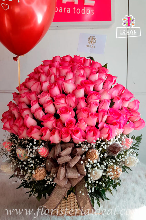 Lindo Arreglo Floral de una cara PREMIUM elaborado en bellas rosas, acompañado de fresas cubiertas de chocolate, globo en helio y tarjeta con mensaje deseado para la ocasión.