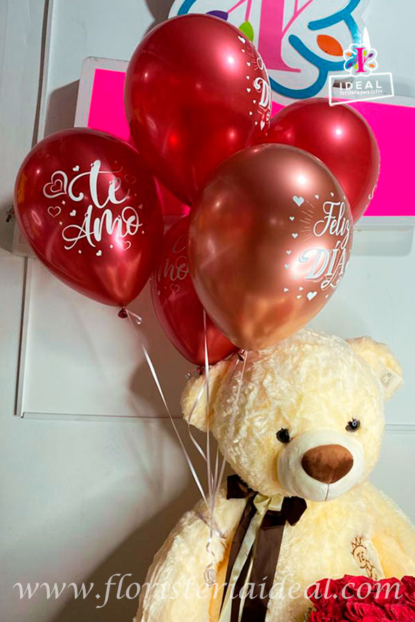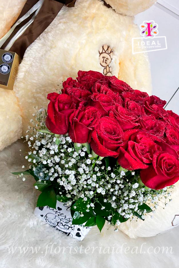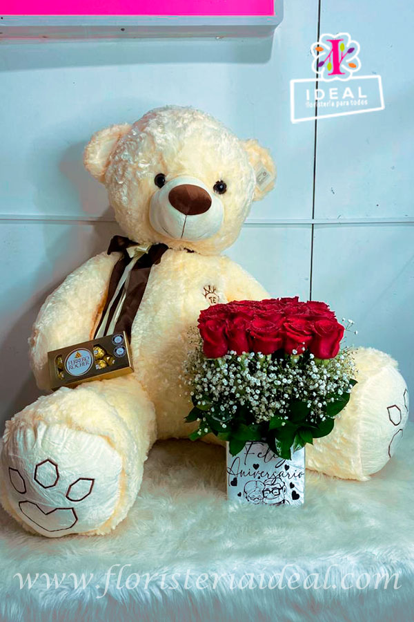 Espectacular oso gigante de peluche medida 80cm, acompañado de delicado arreglo floral elaborado en bellas rosas , caja de chocolate y tarjeta para la ocasión con mensaje deseado.