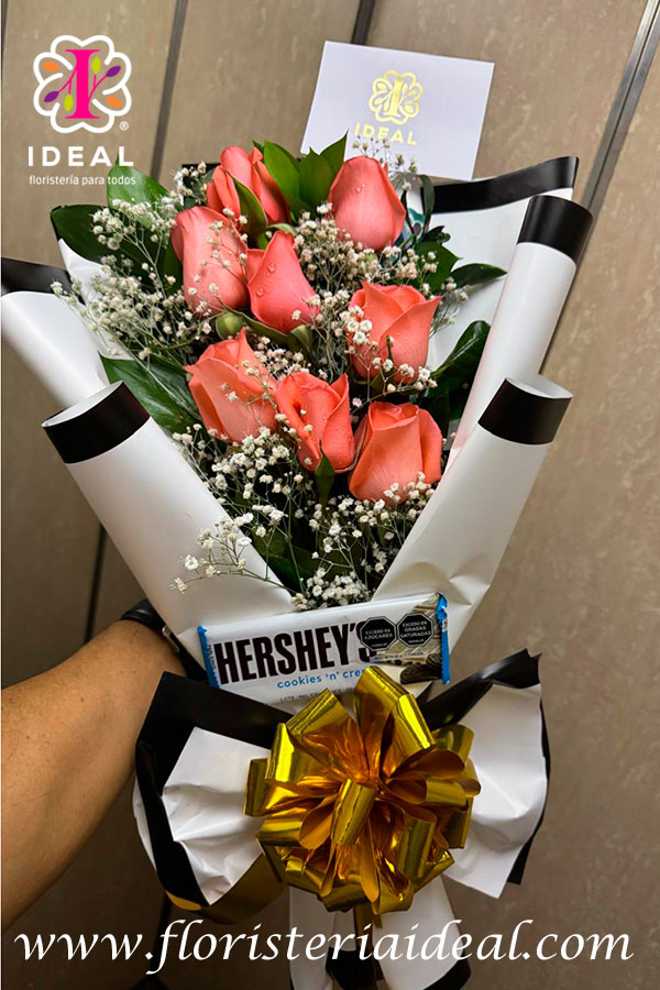 hermoso arreglo en color salmon, con una chocolatina hershey