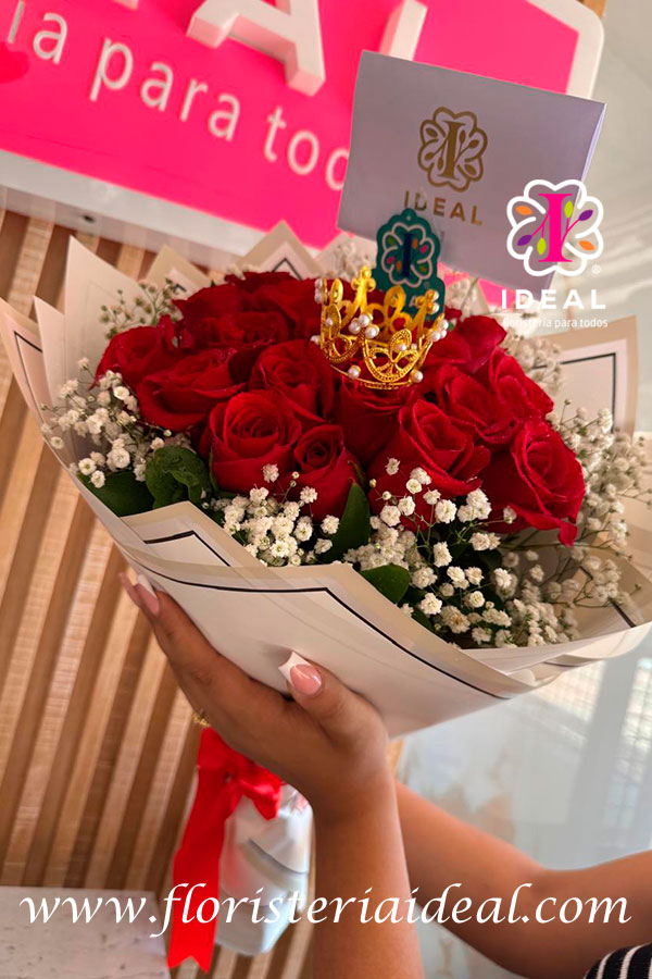 hermoso bouquet de rosas rojas acompañado de una espectacular corona dorada sorprende a tu princesa con este espectacular arreglo