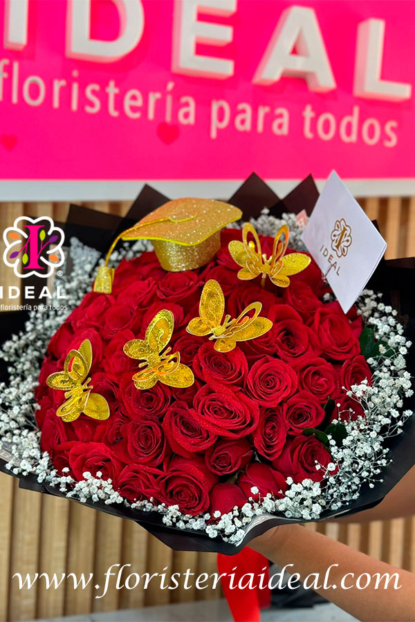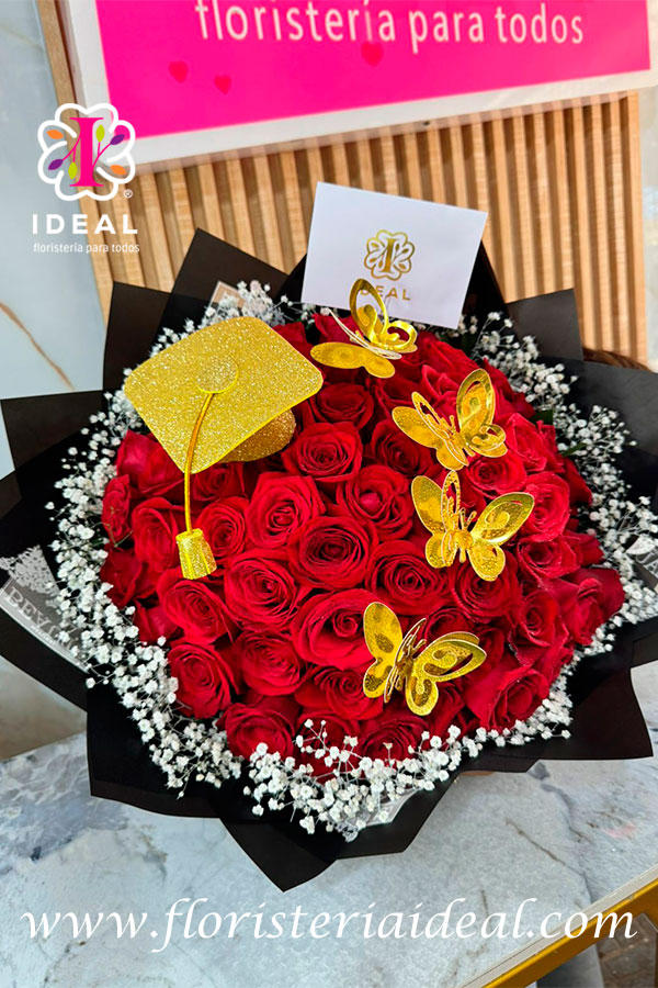 hermoso buoquet para que le regales a la graduada mas hermosa elaborado en rosa roja adornado con unas espectaculares mariposas y un birrete