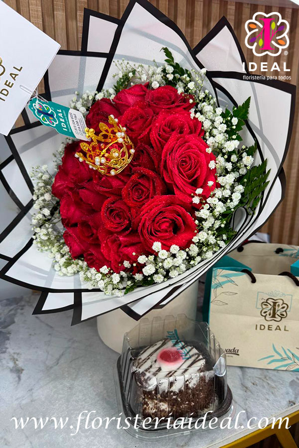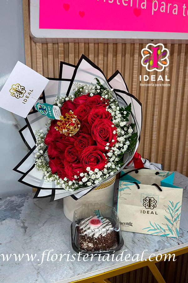 hermoso bouquet de rosa roja acompañado de una deliciosa torta