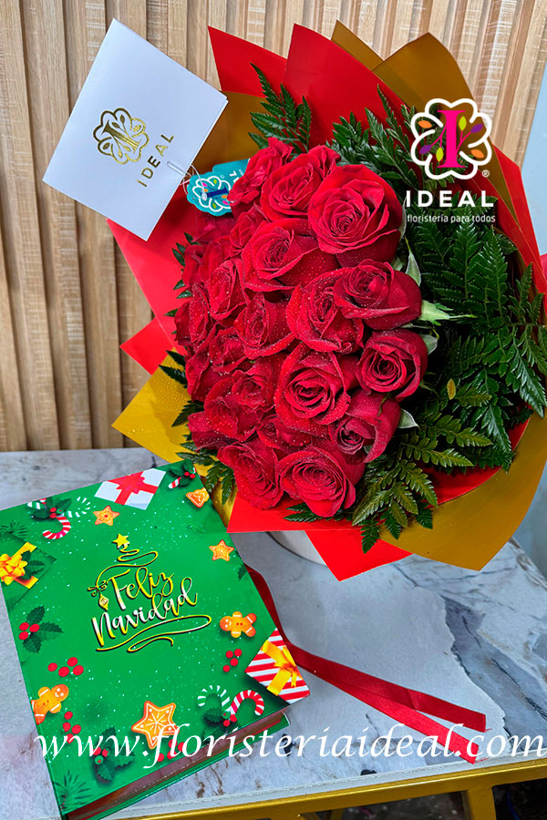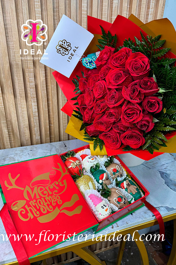 hermoso bouquet de rosas rojas acompañado de unas fresas de navidad de chocolate