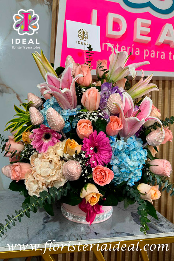 espectacular ramo premium redondo en diversas flores acompañado de chocofresas