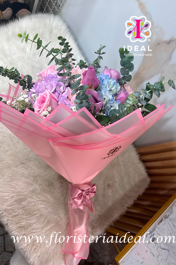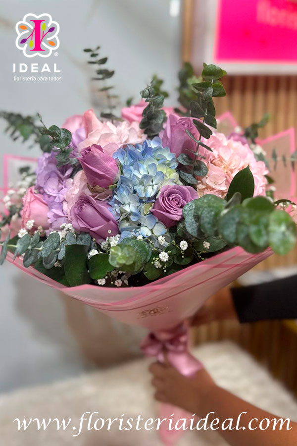 espectacular ramo de mano elaborado en hortencias y rosa lila con follaje verde