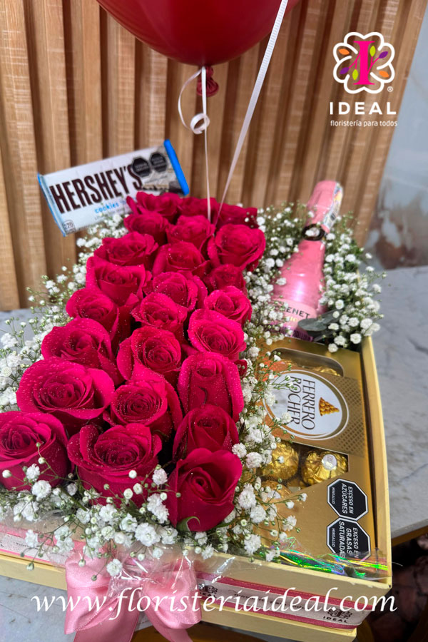 hermoso arreglo floral en rosa fuccia con unos chocolates ferrero y una champang