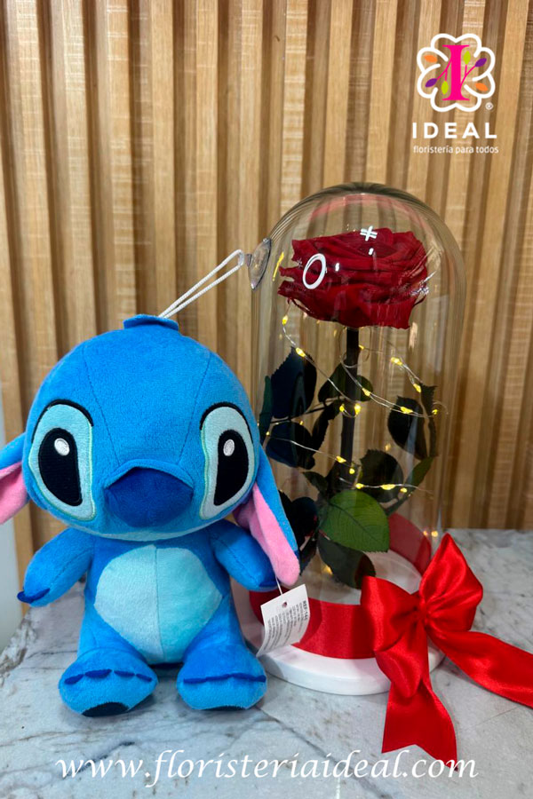 hermosa rosa preservada acompañada de un stich azul