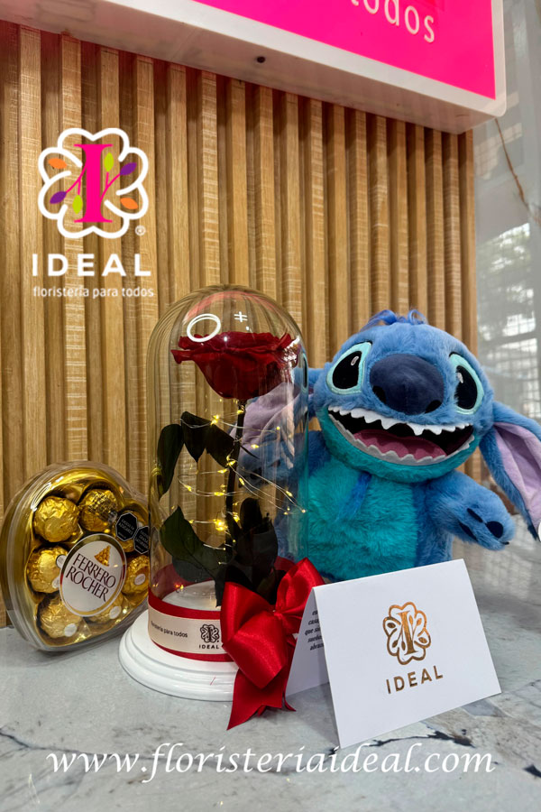 delicada rosa roja preservada acompañada de un delicioso ferrero de 8 y un stich