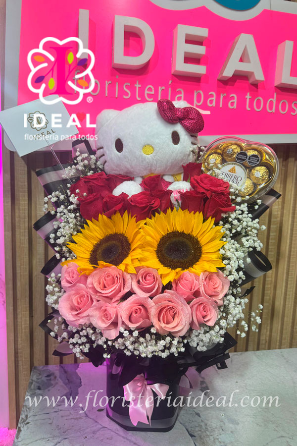 hermoso arreglo floral elaborado en rosas y girasoles y hello kity