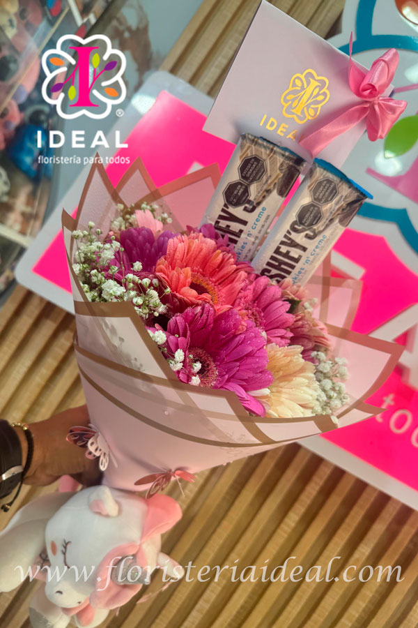 hermoso arreglo de mano elaborado en gerveras acompañado de unos chocolates