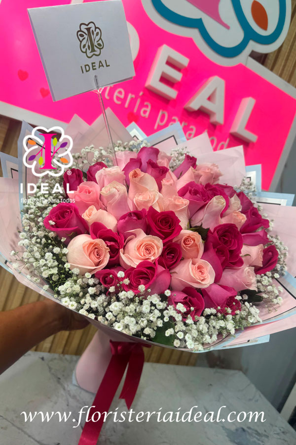 delicado arreglo de mano, ideal para sorprender a esa chica especial elaborados en tonos rosados y fucsias cantidad 50 unidades de rosa