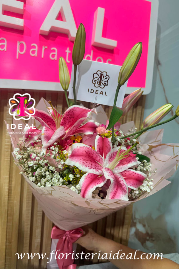 delicado manual elaborado en lirios acompañado de su respectiva tarjeta