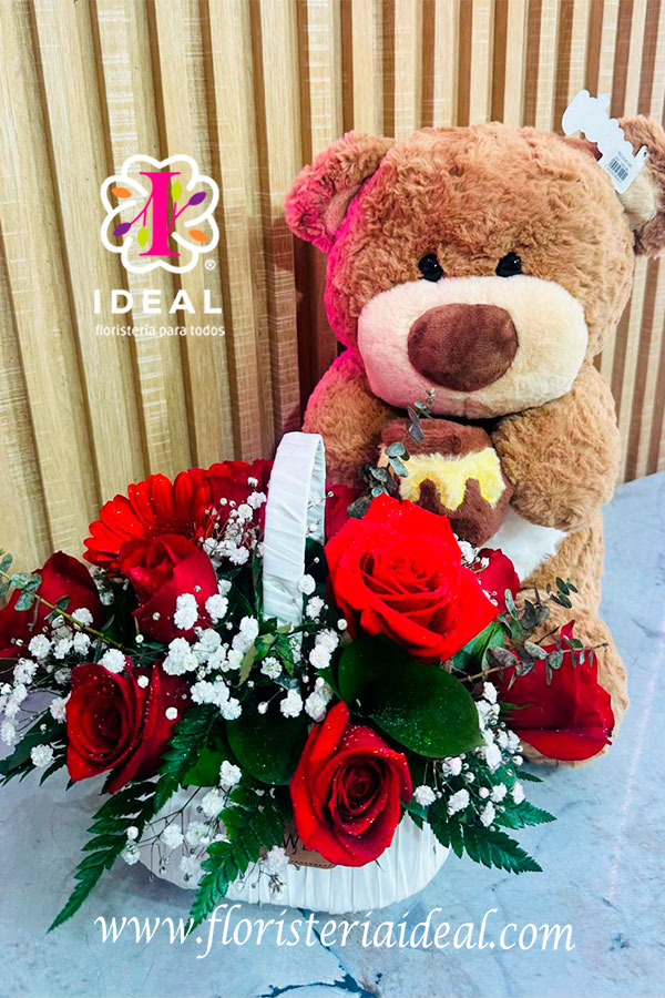 Hermoso arreglo de rosas elaborado en una canastica en forma de un delicado bolso, esta echo en lindos follajes verdes, con un hermoso peluche en tamaño mediano que puedes elegir, esta acompañado de una hermosa tarjeta personalizada para la ocasión.