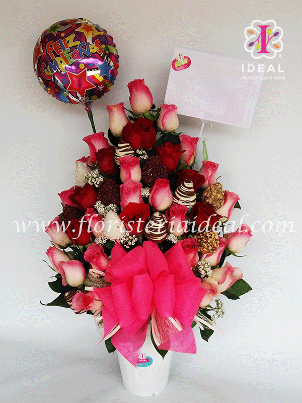 Tierno arreglo de rosas acompa?ado de ricas fresas ba?adas en chocolates incluye globito con mensaje y tarjeta para la ocasion