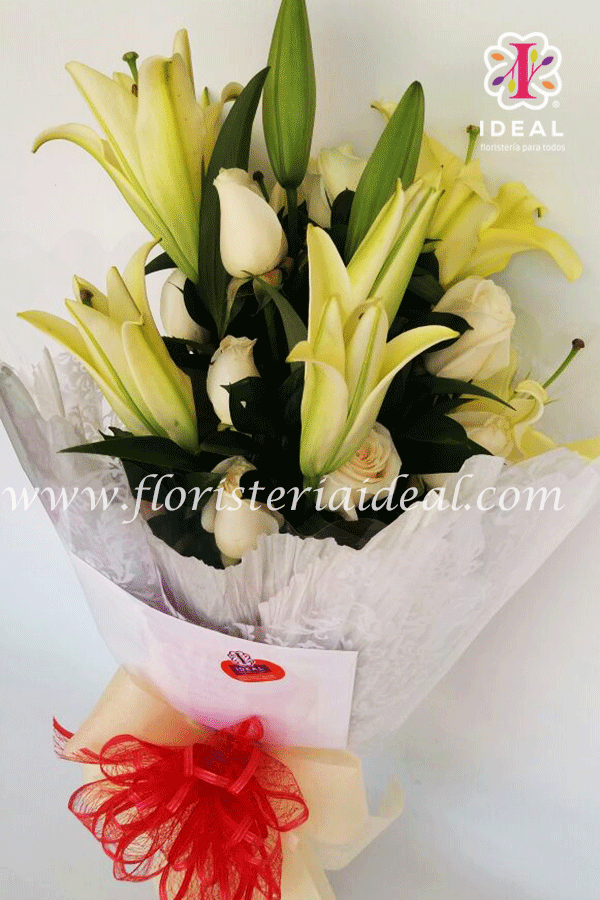 Hermoso detalle floral tipo buquet elaborado con bellas rosas blancas y lindos lirios esta acompañado de follajes verdes, envoltura sobria, y moño rojo + tarjeta para la ocasión.