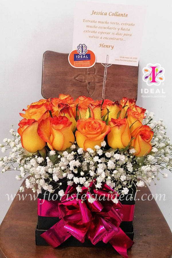 Linda caja de rosas acompañada de tarjeta para la ocasión.