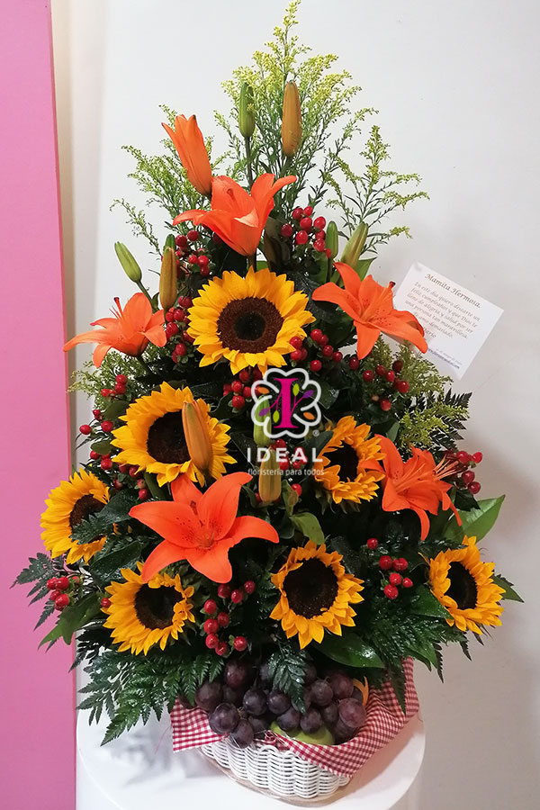 Arreglo floral elaborado en lindos girasoles y bellos lirios esta acompañado de frutas surtidas y tarjeta para la ocasión