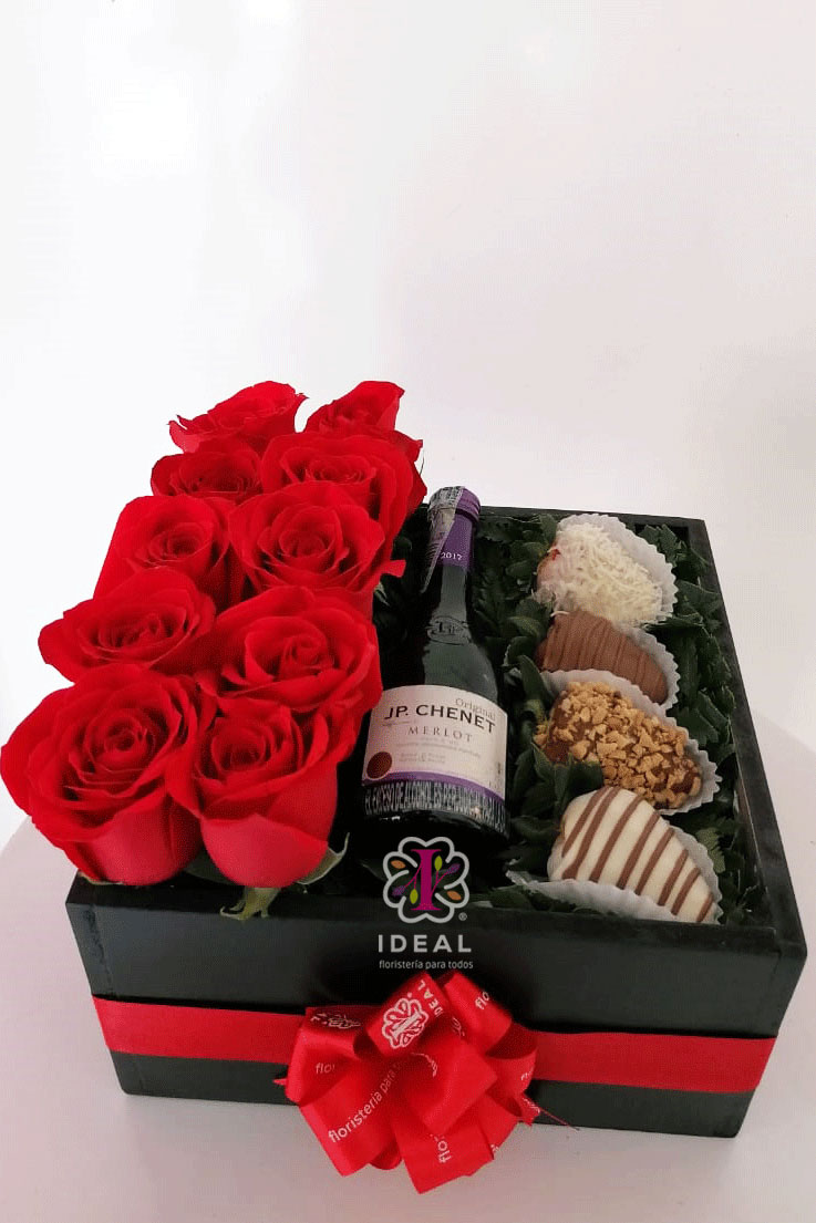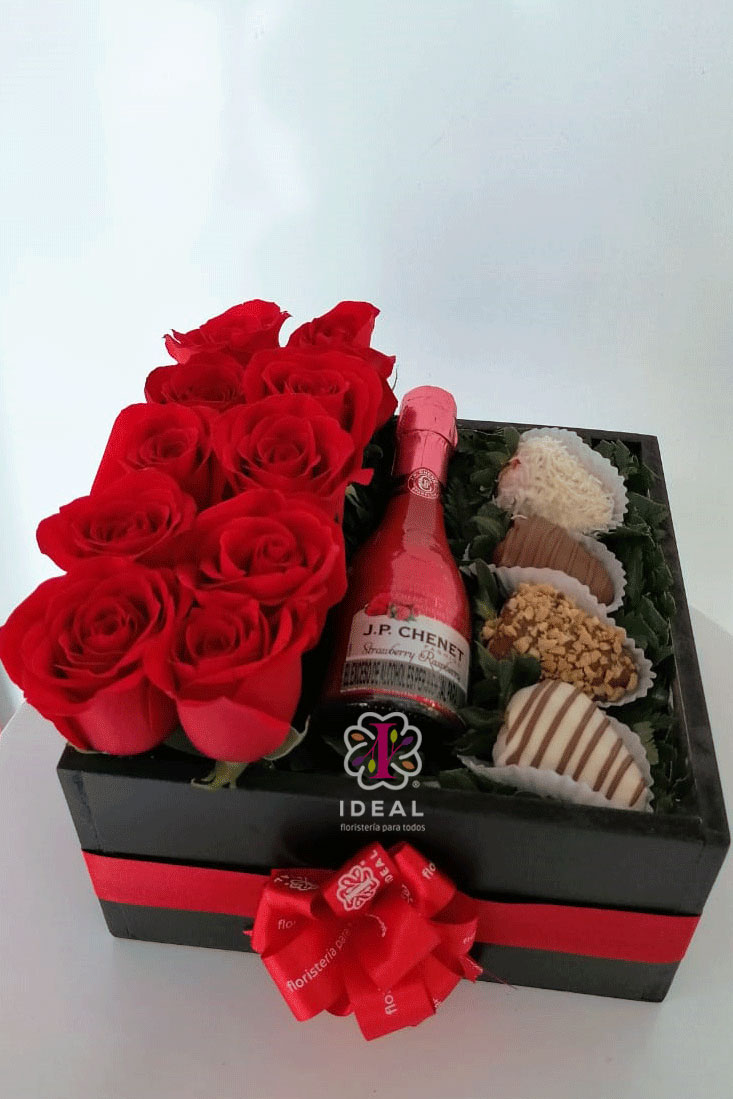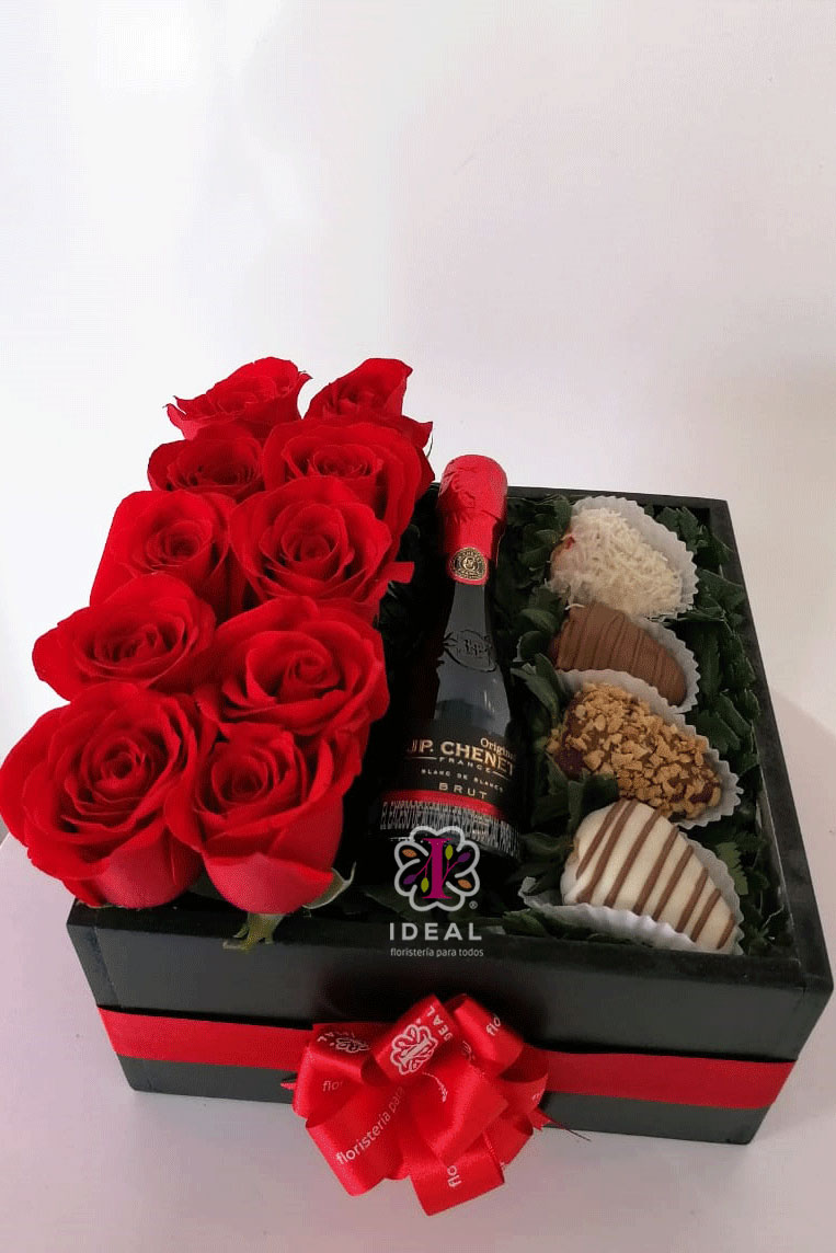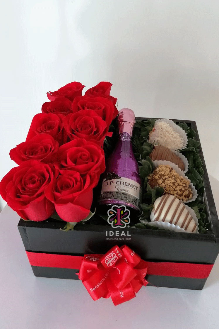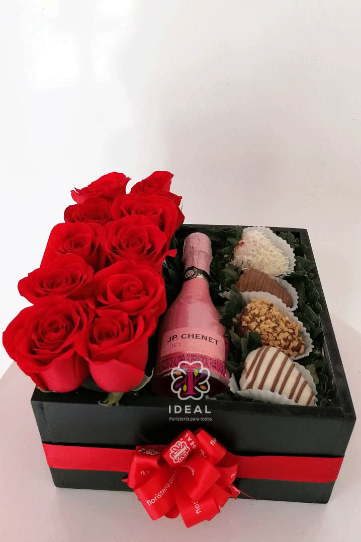 Linda cajita de Rosas acompañada de una botella Chenet y ricas fresas de chocolate