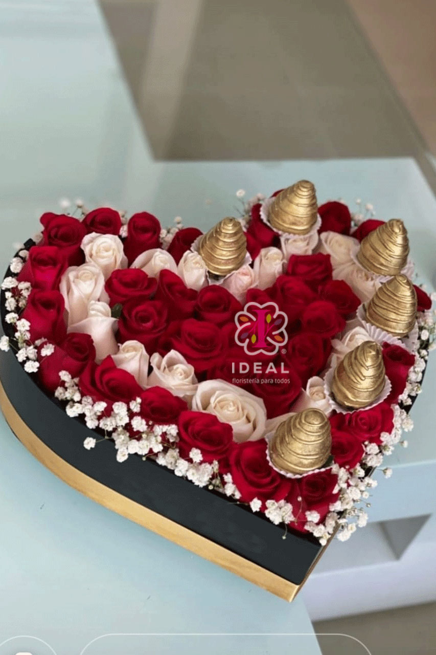 Hermoso arreglo floral en forma de corazón acompañado de bellas Rosas y Fresas de chocolates color dorado, incluye tarjeta para la ocasión