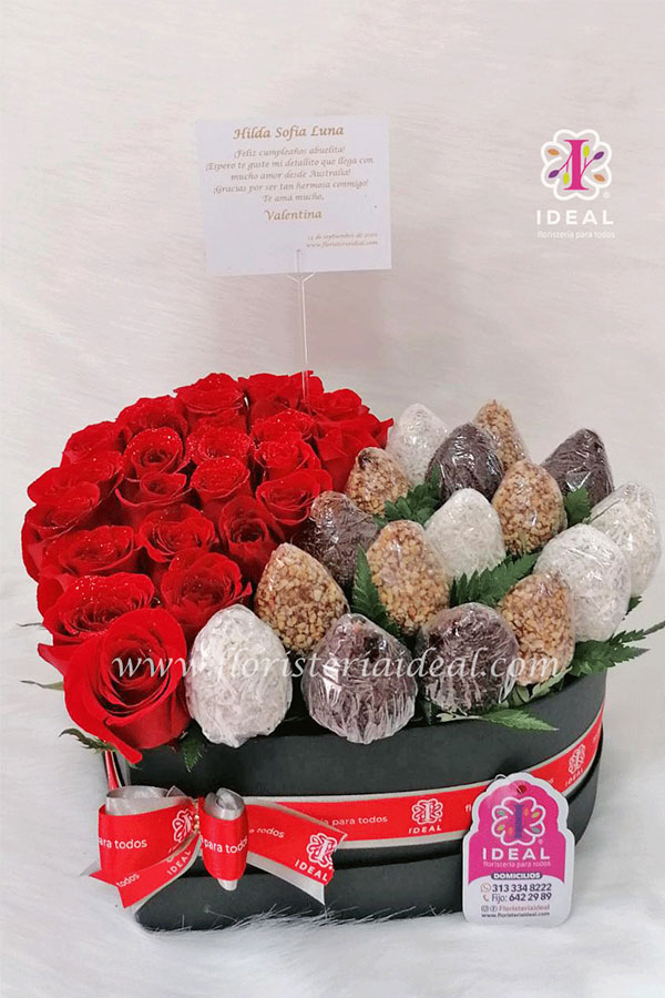 Linda caja en forma de corazón acompañada de Rosas y Fresas cubiertas de chocolatesCantidad de Rosas: 24 unidadesCantidad de Fresas: 16